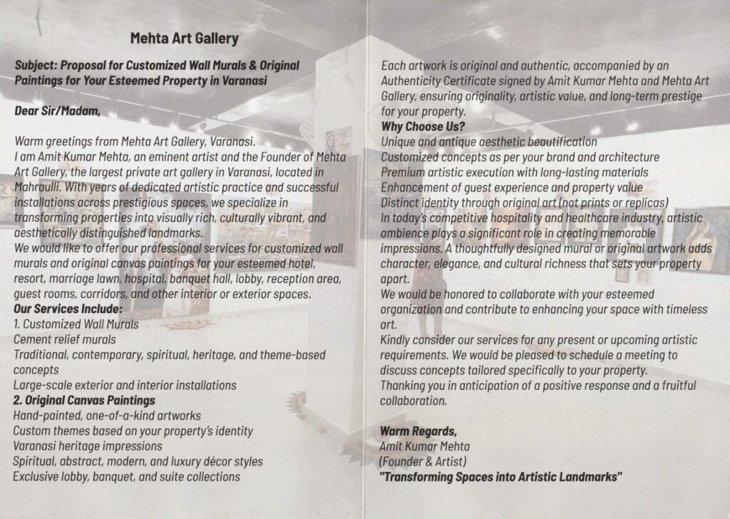 Developers, architects, businesses, institutions, and homeowners looking for premium artistic interiors can collaborate with Mehta Art Gallery to transform their spaces.